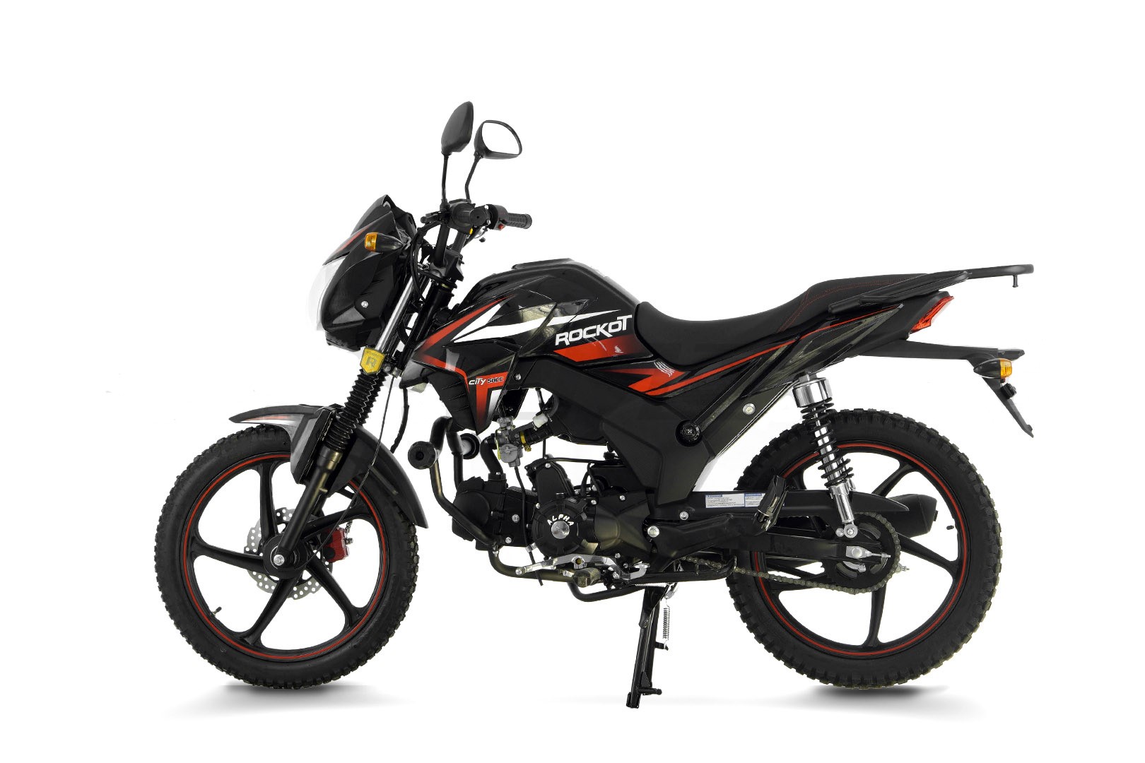 Двигатель мопеда ROCKOT ALPHA CITY M-12 — это то, за что всем так полюбилась техника данного класса. Надежность, высокий ресурс, простота в обслуживании и ремонтопригодность — это главные качества двигателей, устанавливаемых на мопеды ROCKOT ALPHA. Итак, в качестве двигателя здесь установлен четырехтактный мотор с горизонтальным цилиндром, объемом 49 кубических сантиметров. Коробка передач — четырехступенчатая с многодисковым сцеплением в масляной ванне с классической мотоциклетной схемой переключения (1N234). Запуск двигателя может производиться рычагом кик-стартера или нажатием кнопки электростартера. В комплекте с мопедом поставляется тюнинг-комплект в виде цилиндро-поршневой группы увеличенного объема 120сс, которая устанавливается “Bolt-On” и не требует замены коленчатого вала. Тюнинг комплект устанавливается по желанию пользователя или самостоятельно.