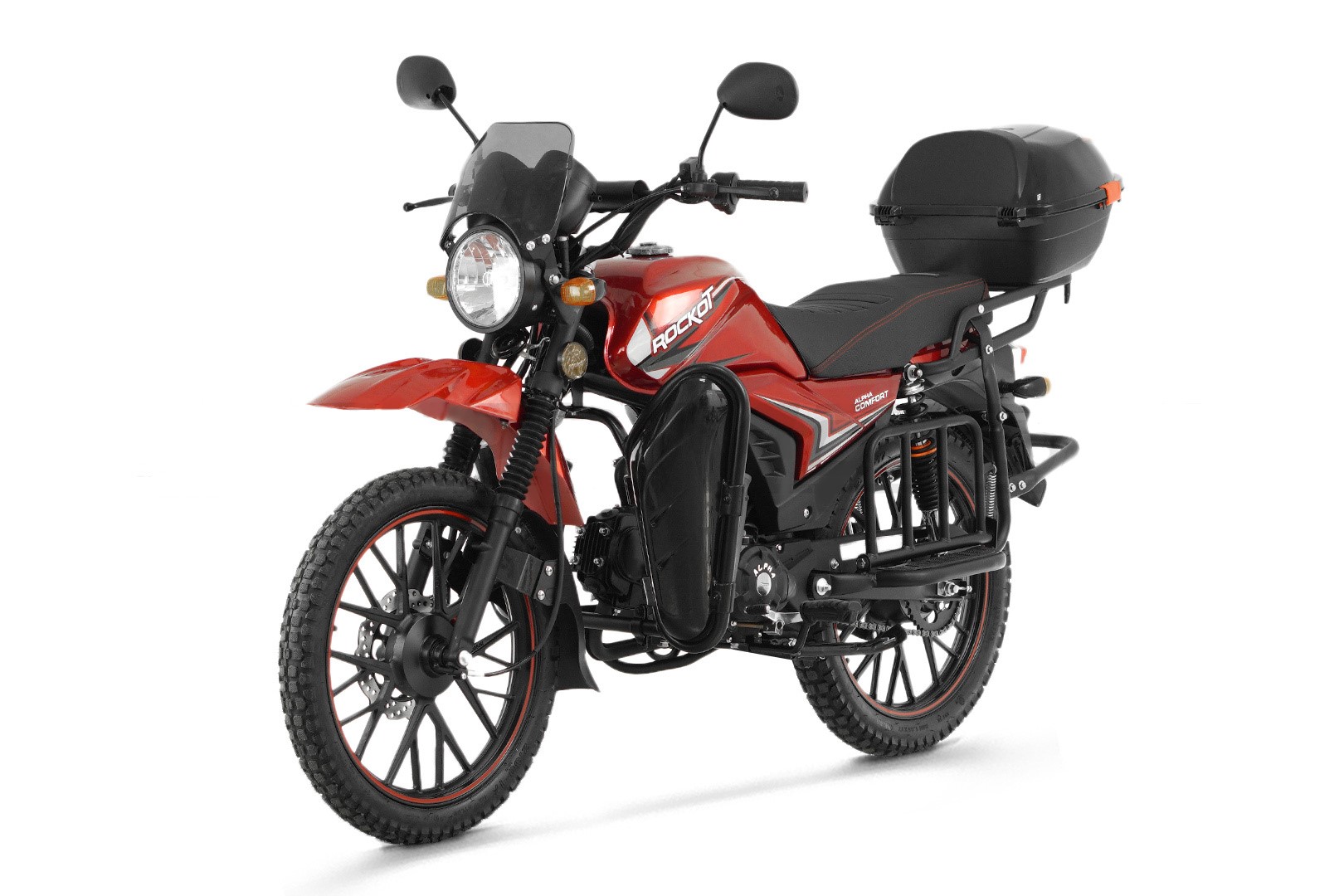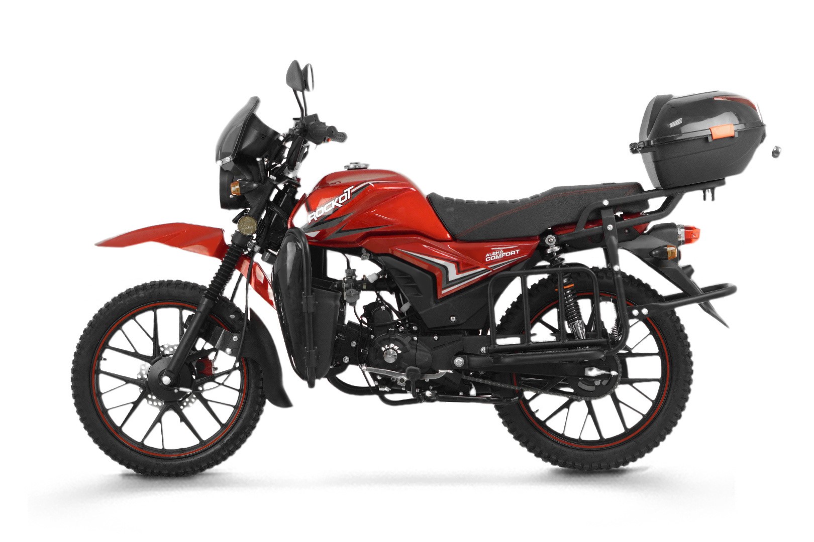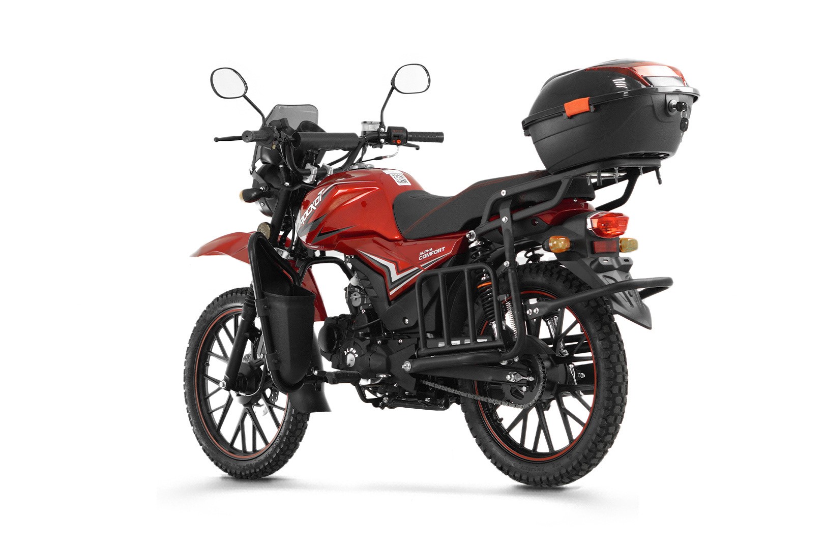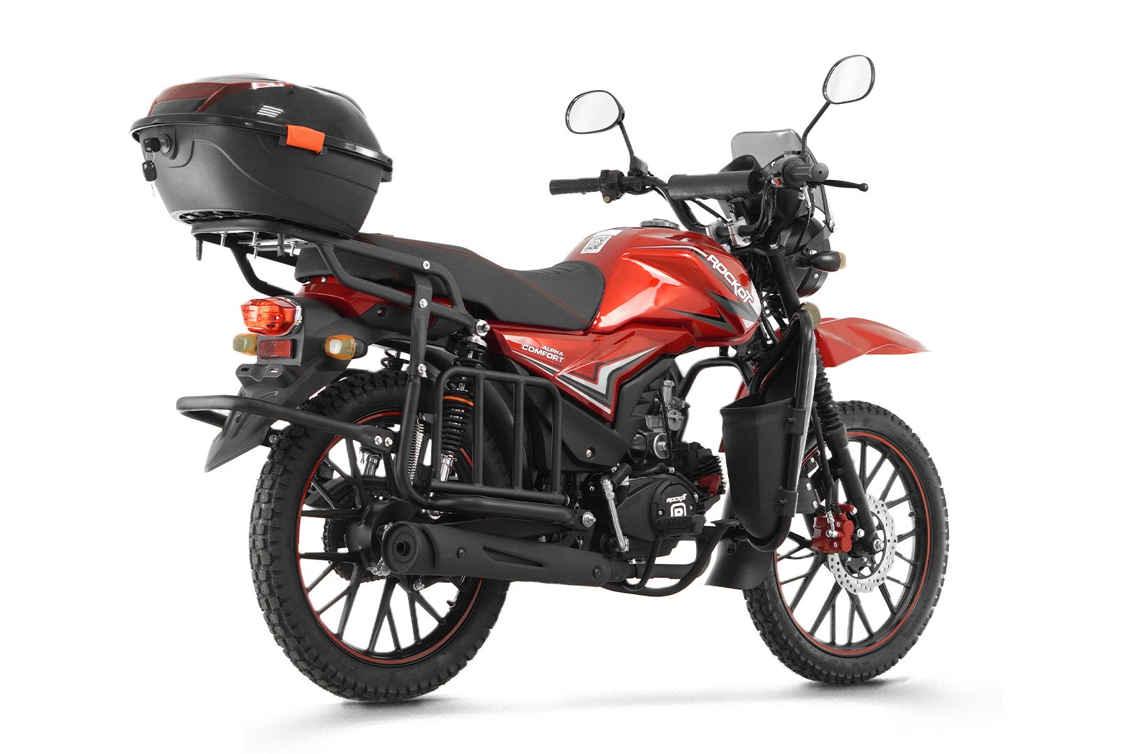 Мопед ROCKOT ALPHA COMFORT оснащается тем же топливным баком и облицовочным пластиком, что и мотоцикл QUEST 150. Их основное визуальное отличие – это расцветки. ROCKOT ALPHA COMFORT выпускается в четырех цветах: синий, красный, черный и серый. Для снижения нагрузки водителя от встречного потока воздуха, над круглой классической фарой установлено ветровое стекло. Также в данной комплектации мопед обрел боковые дуги со встроенными карманами, которые не только вмещают большой объем груза, но также выполняют ветрозащитную функцию. Задние боковые рамки и вместительный центральный кофр прямо указывают на приспособленность мопеда к выездам на природу, будь то пикник, рыбалка или охота. Вы с комфортом проедете везде, а благодаря вместительности багажной системы, сможете организовать комфорт вокруг себя.