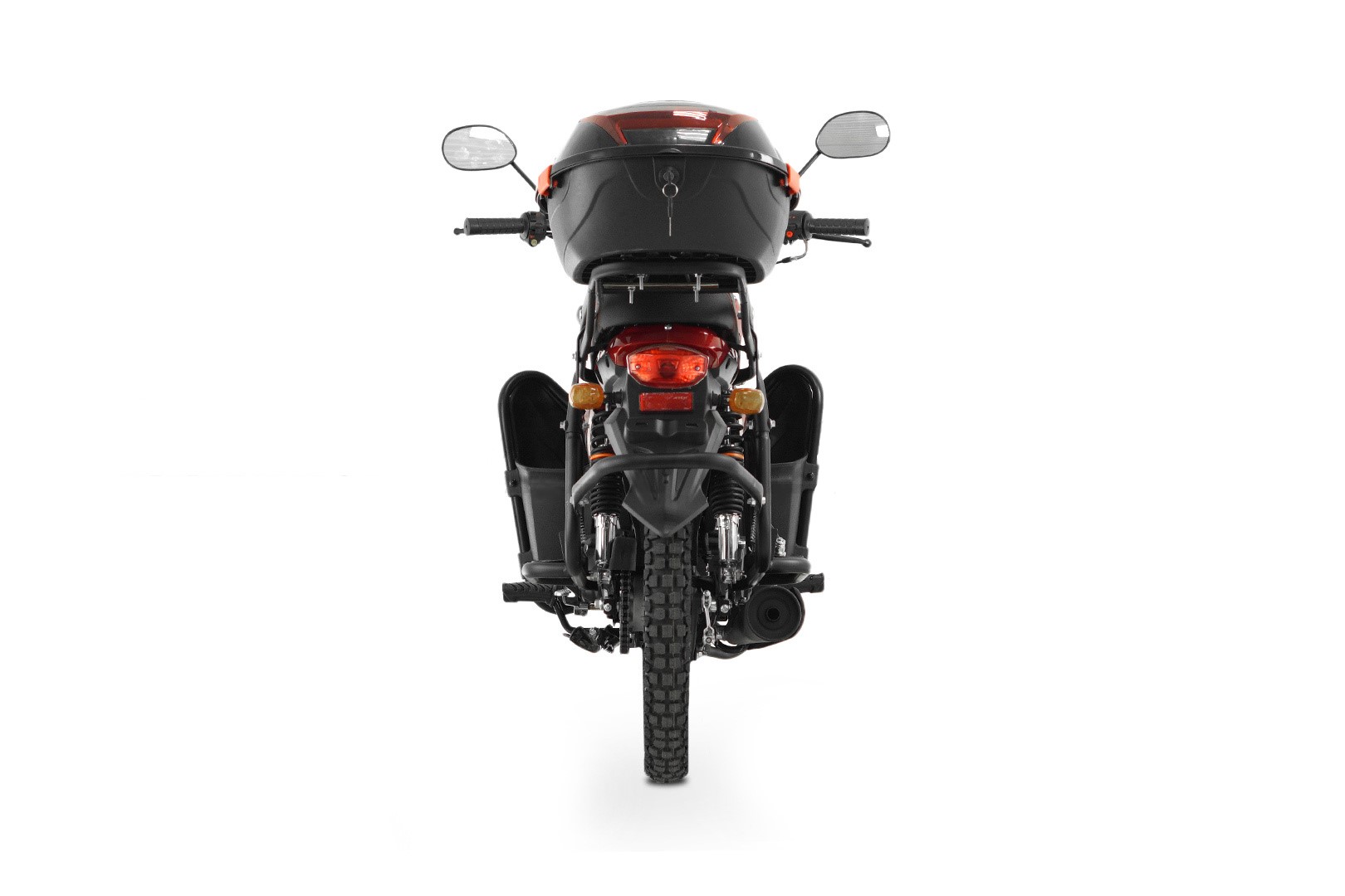Богатая комплектация в виде предустановленных с завода передних боковых карманов, складных рамок для боковых сумок и центрального кофра, выгодно отличает эту модель от большинства других мопедов.