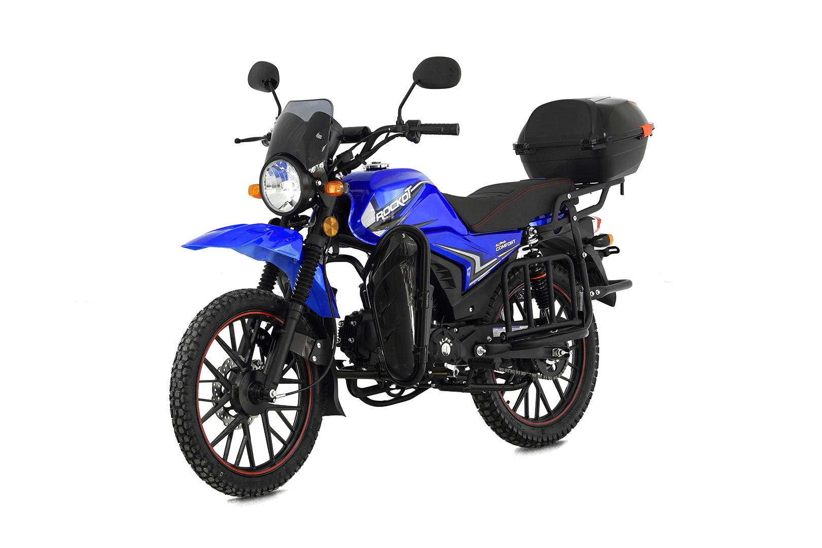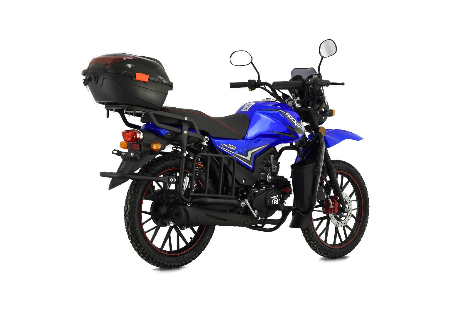 Мопед ROCKOT ALPHA COMFORT оснащается тем же топливным баком и облицовочным пластиком, что и мотоцикл QUEST 150. Их основное визуальное отличие – это расцветки. ROCKOT ALPHA COMFORT выпускается в четырех цветах: синий, красный, черный и серый. Для снижения нагрузки водителя от встречного потока воздуха, над круглой классической фарой установлено ветровое стекло. Также в данной комплектации мопед обрел боковые дуги со встроенными карманами, которые не только вмещают большой объем груза, но также выполняют ветрозащитную функцию. Задние боковые рамки и вместительный центральный кофр прямо указывают на приспособленность мопеда к выездам на природу, будь то пикник, рыбалка или охота. Вы с комфортом проедете везде, а благодаря вместительности багажной системы, сможете организовать комфорт вокруг себя.