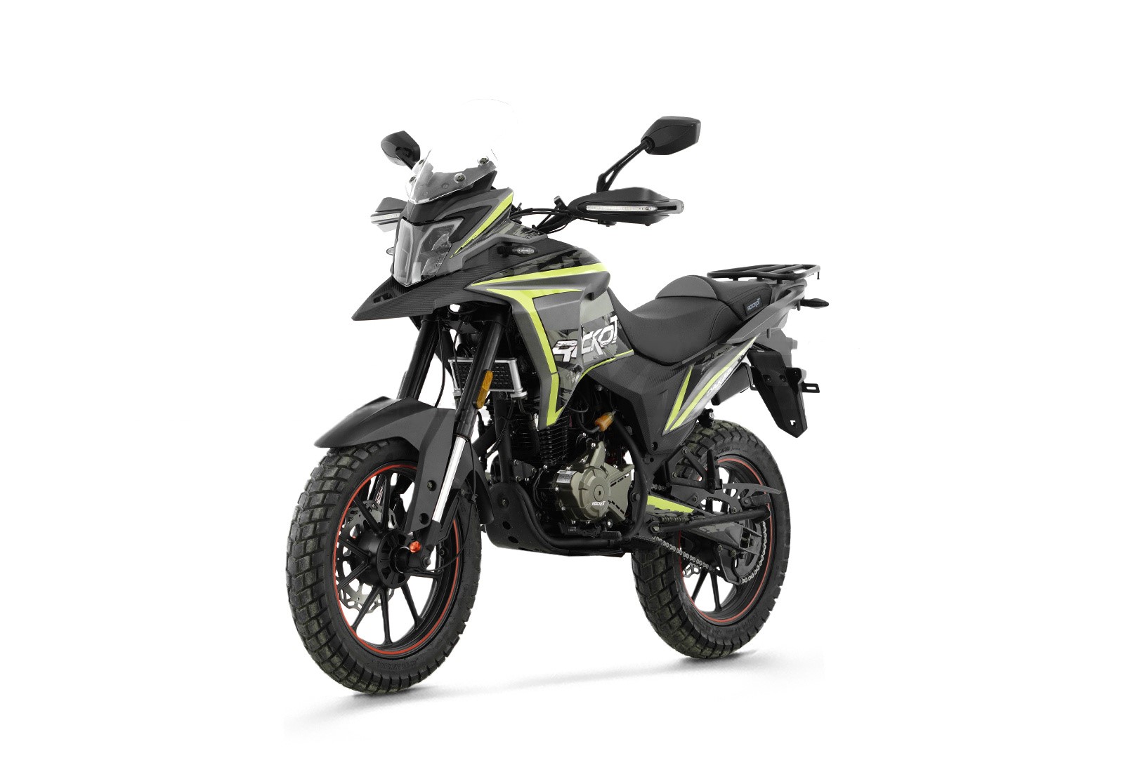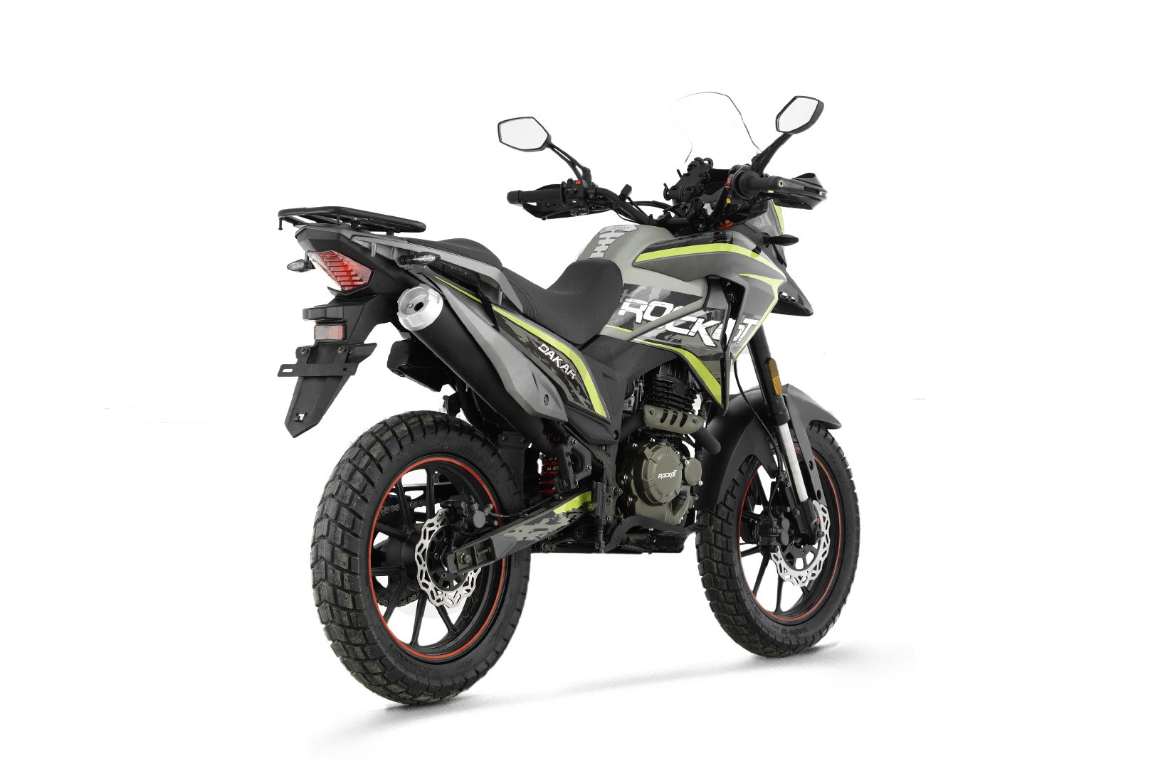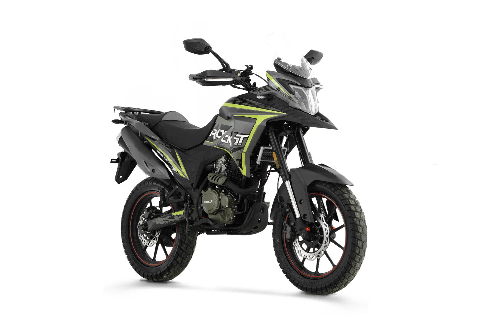 ROCKOT DAKAR 2.0 имеет уникальную стилистику кузовного пластика в яркой желтой графике. Как и подобает классу туристических эндуро мотоциклов, пластик имеет обтекаемую форму с закрытой рулевой колонкой. Облицовка топливного бака в соединении с верхним передним крылом и фарой головного света создают отличную обтекаемую форму и частично закрывают водителя от потока встречного воздуха. В передней части мотоцикла, над современной яркой светодиодной фарой, установлено высокое ветровое стекло, которое отводит встречный поток воздуха вверх и делает длительные поездки на мотоцикле более комфортными. Также дополнительная ветрозащита установлена на руле мотоцикла, и представляет собой гибкую защиту рук со встроенными светодиодными повторителями поворотов. В качестве колес, мотоцикл оснащен стильными литыми колесными дисками и универсальным шинами, диаметром 17 дюймов. На руле установлены держатель для смартфона и USB-розетка, что сегодня является неотъемлемой частью туристического мотоцикла.